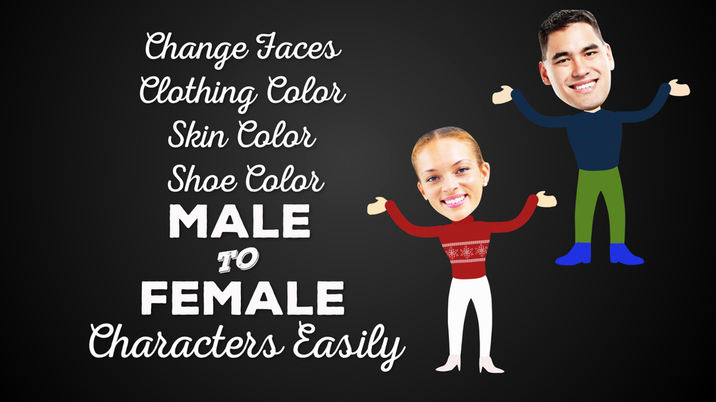 Feature up to 19 characters in this video. You can choose the face, body type, colors, shoes for each character in each scene any way you like. 4 scenes with animated text all customizable. Happy and fun characters can be male or female and faces are easily replaceable.