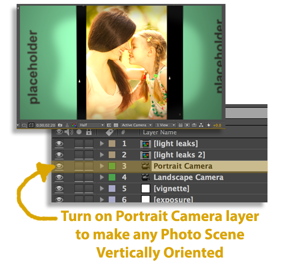 Every animated photo scene can easily be switched from landscape to portrait orientation- that’s TWO different animations in one scene! Just turn on the cam-era layer you need- Landscape or Portrait- and the template does all of the work for you.