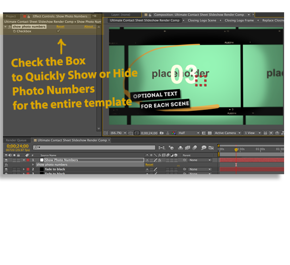 Ultimate-Contact-Sheet-Slideshow-template.aep, markings.psd, arrows.psd, (2) Light Leak quicktime movies with Alpha